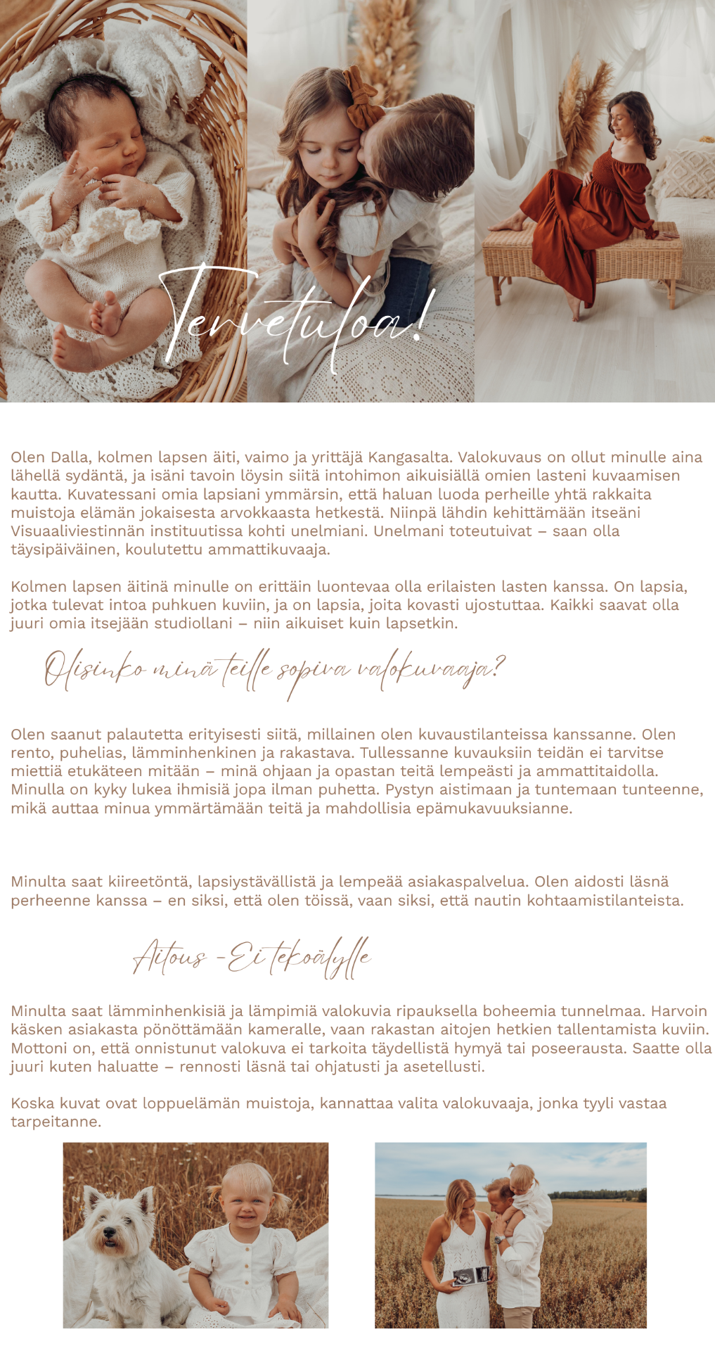 Minulta saat lämminhenkisiä ja lämpöisiä valokuvia ripauksella boheemia sisustusta. Minä harvoin käsken asiakasta pönöttämään kameralle, vaan rakastan aitojen hetkien tallentamista kuviin. Mottoni on, että onnistunut valokuva ei tarkota lapselta täydellistä hymyä ja poseerausta. He saavat olla mitä ovat, lapsia kaikkine ilmeineen ja eleineen🤍